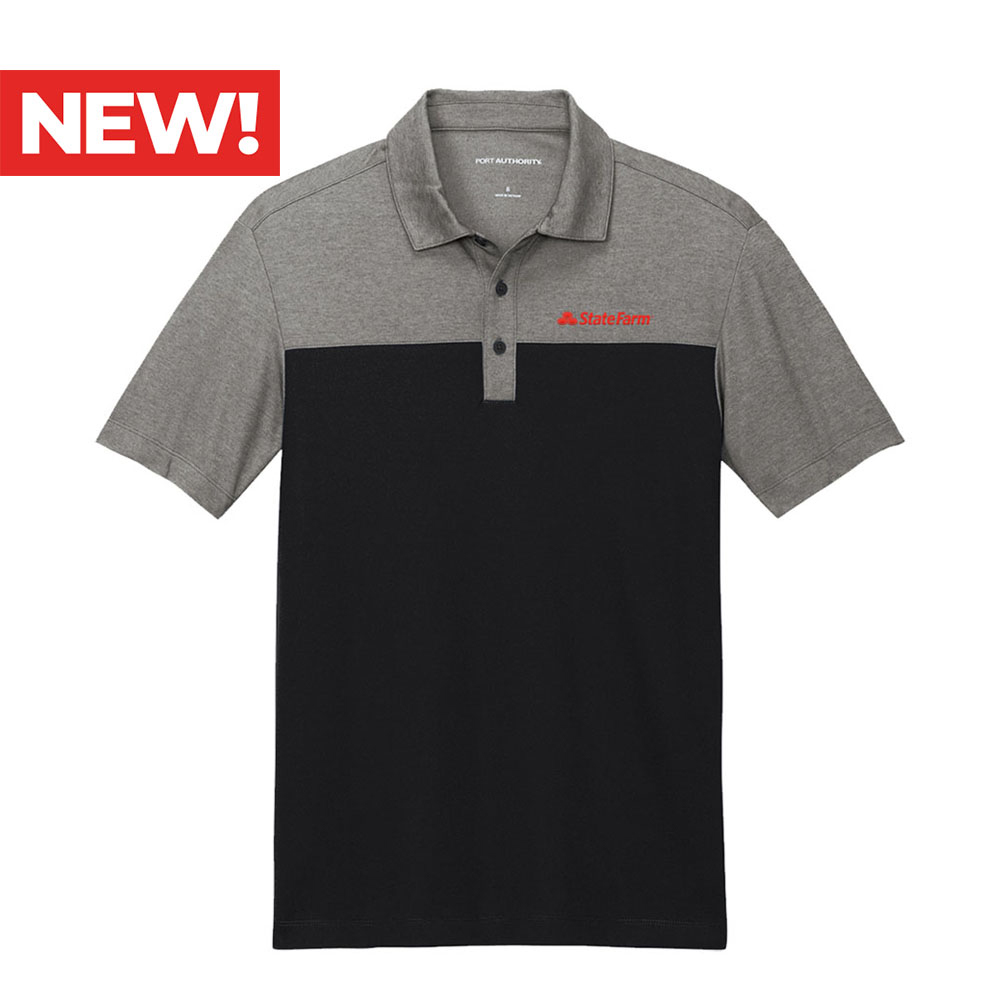 This grey/black polo is embroidered with State Farm logo on the left chest above seam.